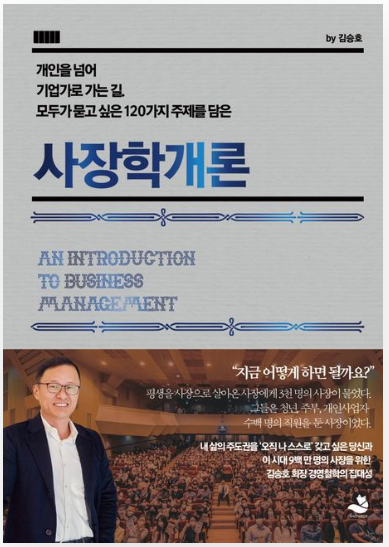 개인을 넘어 기업가로 가는 길. 모두가 묻고 싶은 120가지 주제를 담은 [사장학개론]을 읽고, 사업을 준비하면서 자기계발이 필요한 나에게 도움이 되는 부분들에 대한 생각을 하게 되었고, 이 글을 읽는 여러분들에게도 제가 느낀 점들을 전달해 드리려고 합니다. 이 책에 대한 대략적인 줄거리 및 간략한 저자 소개, 책을 읽으면서 전반적으로 느껴졌던 부분들에 대해서 편하게 리뷰하도록 하겠습니다.